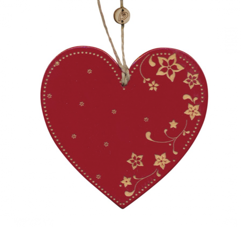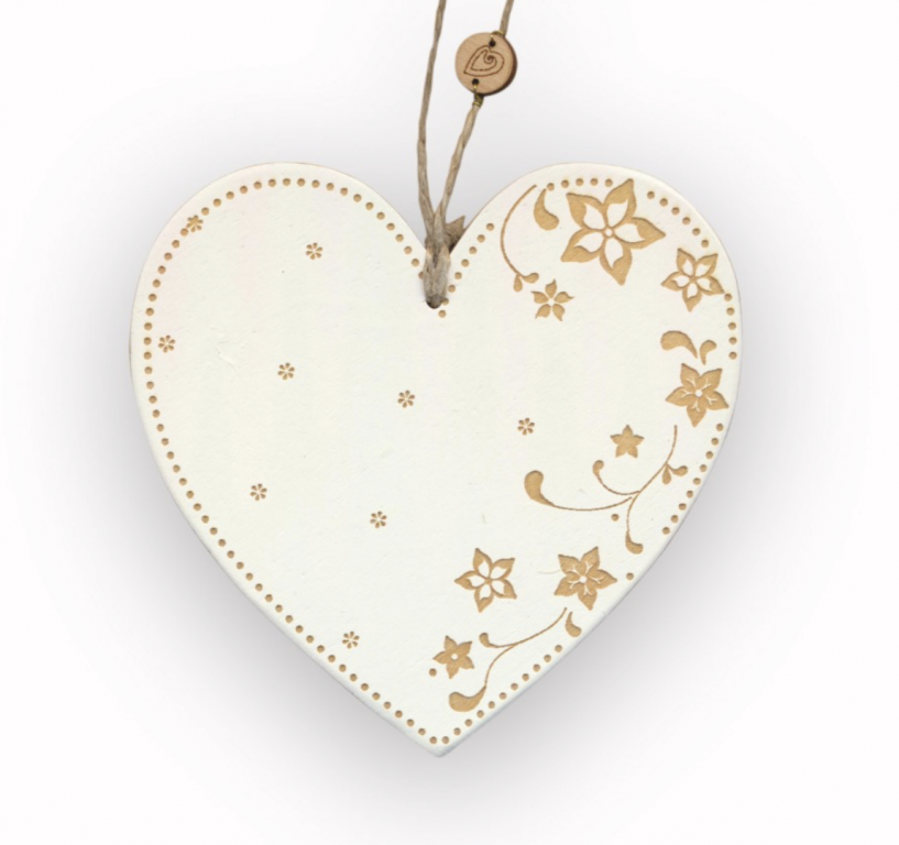 Cœur en bois peint en blanc ou rouge et gravé de motifs floraux